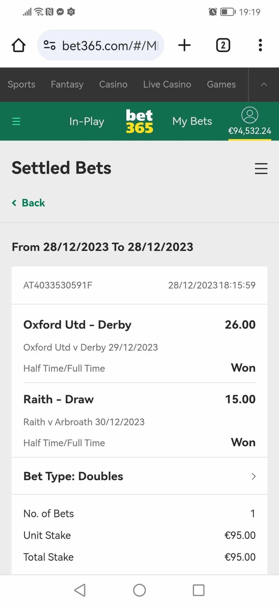 Screenshot from our BETSLIP with Successful Fixed Matches from best bookmaker bet365.com